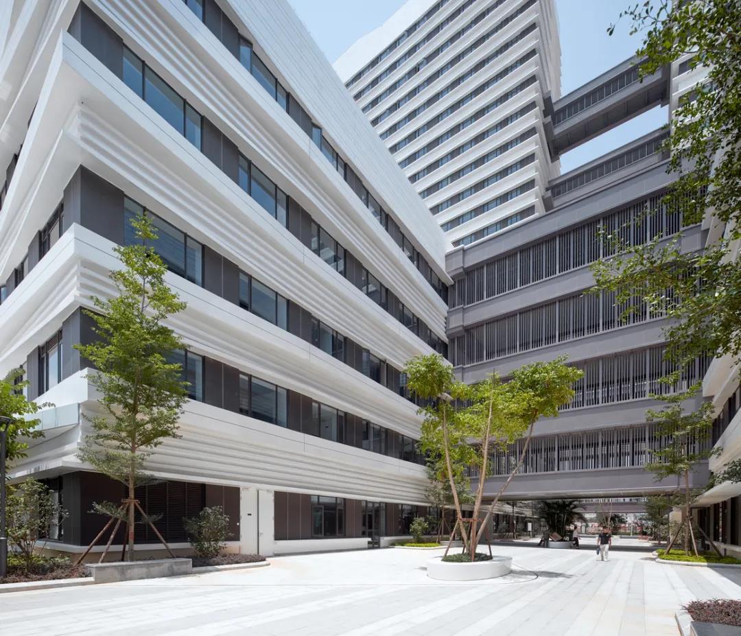 在模塊化排布和重建的基礎(chǔ)上,建筑的外立面將30多萬平方米的建筑以水平折線的幾何連接在一起,從而形成一個(gè)具有節(jié)奏感的整體外部體驗(yàn)。陽光和陰影被建筑立面的紋理所分割,使得使用者可以更關(guān)注建筑的細(xì)節(jié)以及建筑物與自身之間的關(guān)系,這種設(shè)計(jì)表明這是一個(gè)可以提供細(xì)致服務(wù)的醫(yī)療空間。